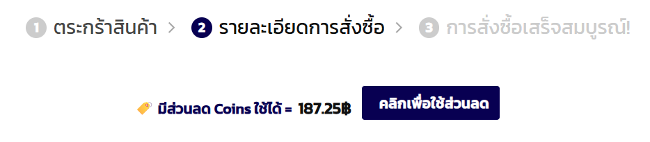 2. ระบบจะแสดง Coins ที่ใช้สามารถใช้เป็นส่วนลดได้ (ลดได้สูงสุด 5%) ให้กด คลิกเพื่อใช้ส่วนลด ได้เลย