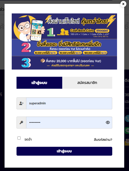 1. สั่งซื้อครบ 1,000 บาท (ก่อน Vat) ในหน้า สั่งซื้อชำระเงิน ให้ลูกค้ากด “เข้าสู่ระบบ”