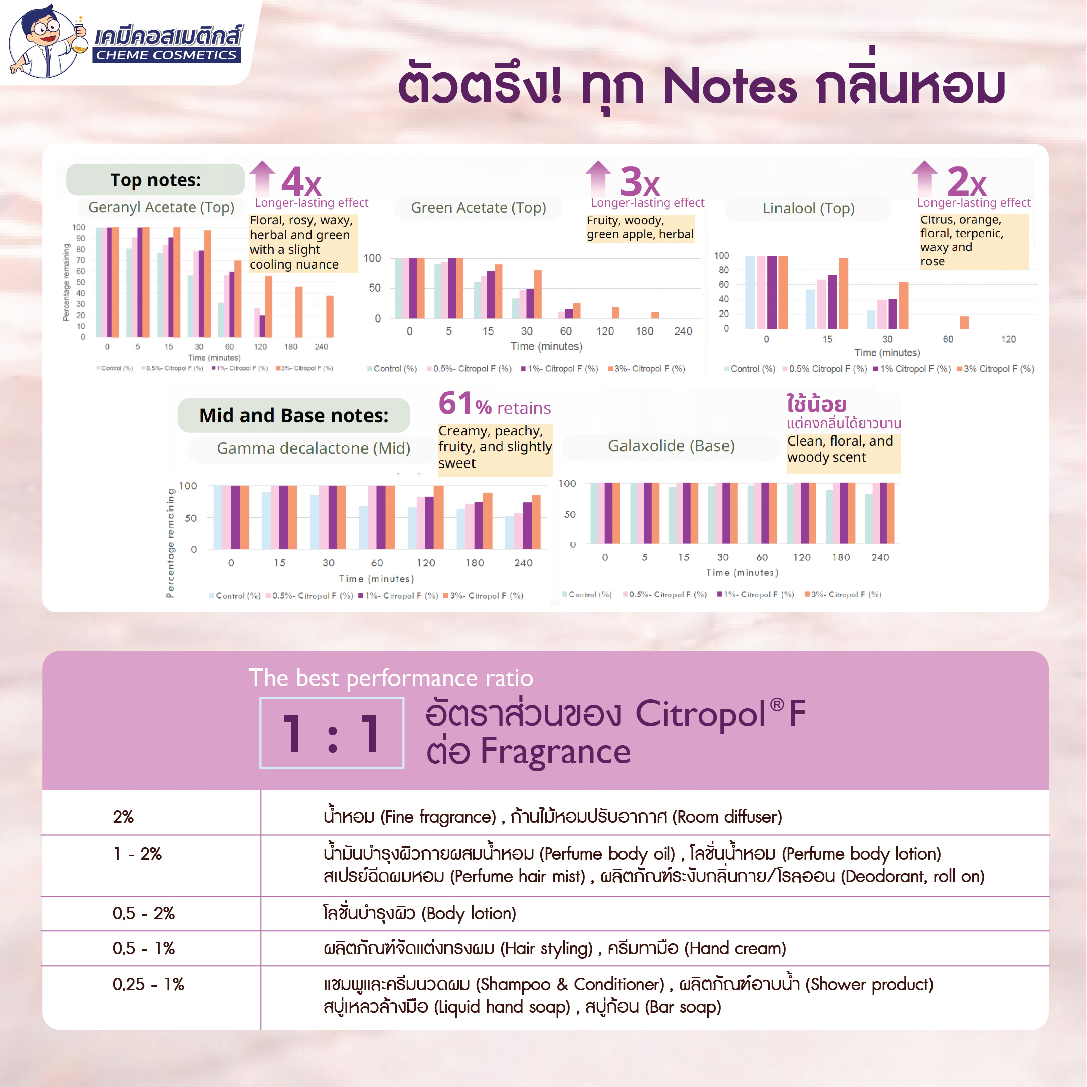 ➡️ สาร High-performing fragrance fixative ประสิทธิภาพสูง ช่วยให้กลิ่นหอมติดทนนานขึ้น ไม่ว่าจะเป็น ‘น้ำหอม’(Fragrances) หรือ ‘น้ำมันหอมระเหย’ (Essential Oils) กลิ่นหอมอันเหนือระดับช่วยสร้างความประทับใจตั้งแต่แรกใช้ ด้วยกลิ่นที่เด่นชัด จากนั้นค่อยๆ ควบคุมการปลดปล่อยกลิ่น หอมต่อเนื่องยาวนาน ท้าให้กลิ่นติดทนมากยิ่งขึ้น โดยทั่วไปแล้ว Citropol®F สามารถช่วยให้กลิ่นหอมของผลิตภัณฑ์ติดทน ยาวนานขึ้นจาก ~30 นาที เพิ่มขึ้นเป็น ~5 ชั่วโมง (10 เท่า)