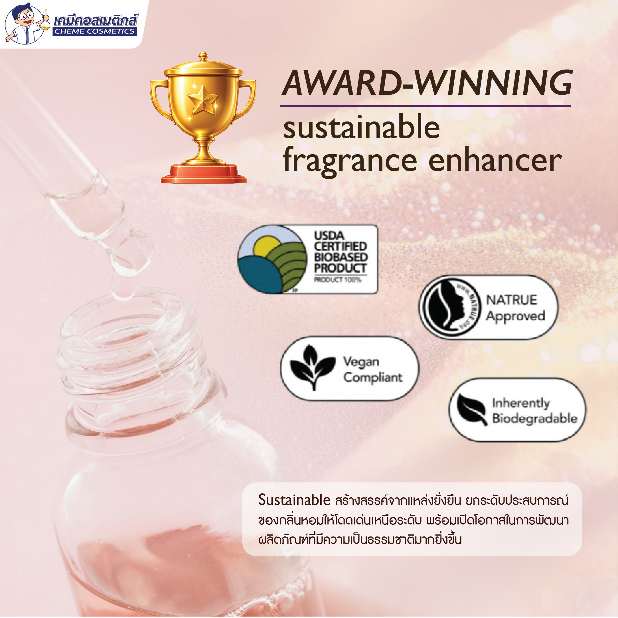 สามารถใช้เป็นตัวช่วยให้กลิ่นติดชัดยาวนานขึ้น หรือใช้ผสมลง ในผลิตภัณฑ์เพื่อลด % การใช้น้ำหอม/น้ำมันหอมระเหยในสูตร 100% Biorenewable, Biodegradable, Biocompatible Clean beauty & Sustainability concept