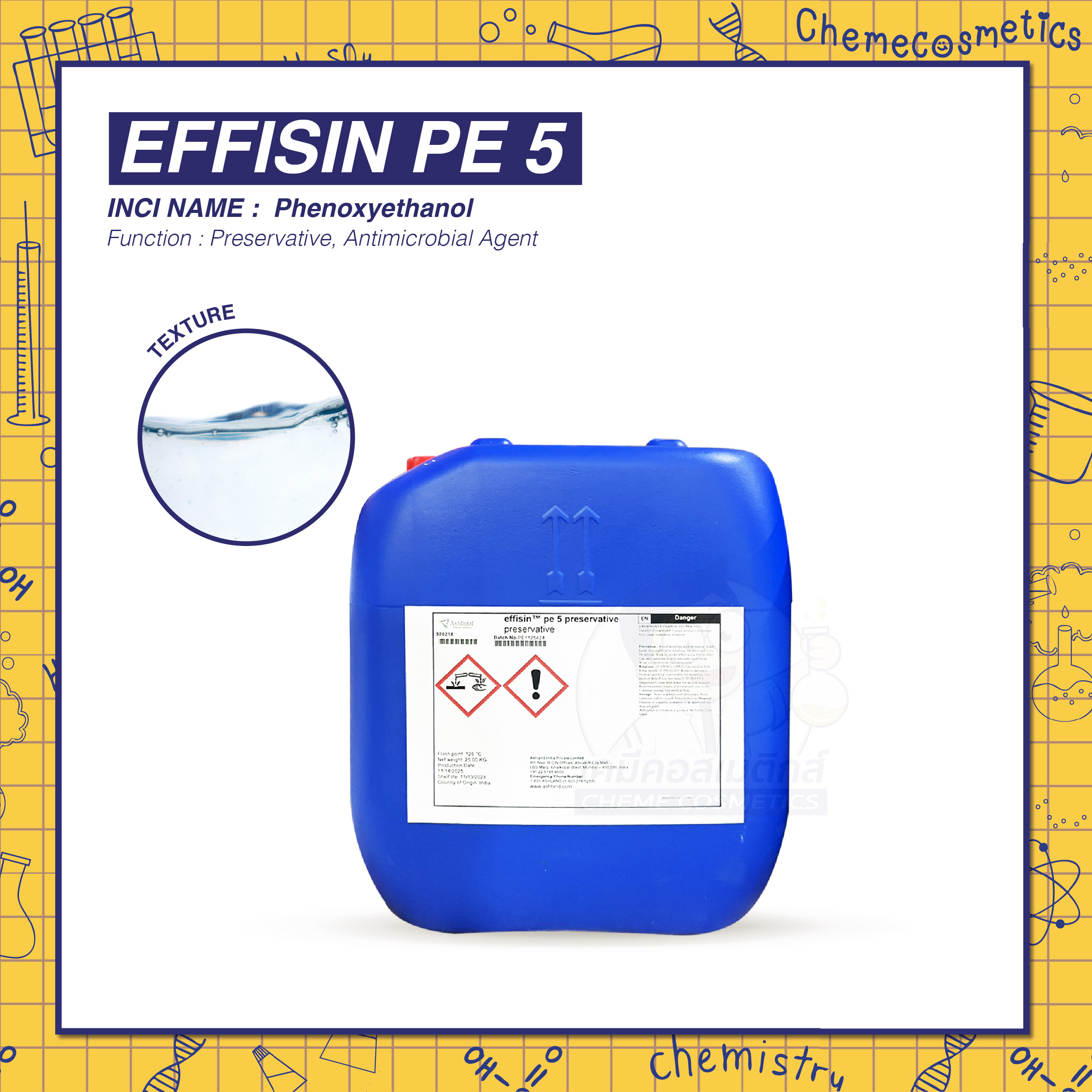 Effisin PE 5 (Phenoxyethanol) สารกันเสียฟีน็อคซี่ ป้องกันแบคทีเรีย ยีสต์ และรา ใช้ได้ทั้ง Leave-on & Rinse-off เสถียรภาพสูงต่อ pH, อุณหภูมิ และการ Hydrolysis