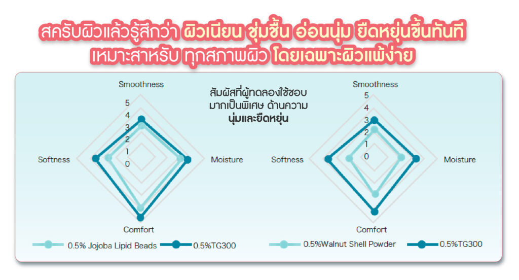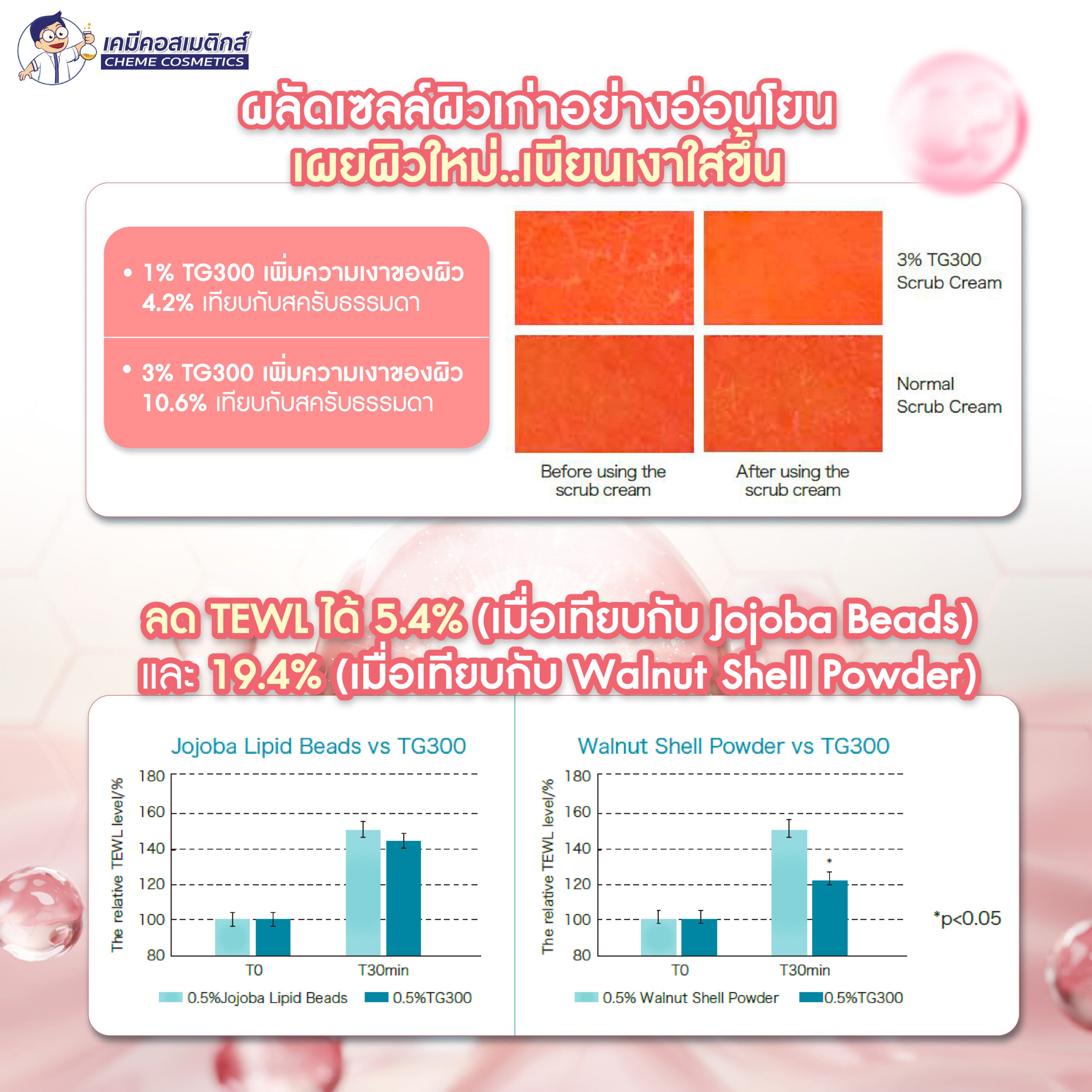 • เมื่อเปรียบเทียบกับเจลลี่บีดและวอลนัทเชลล์ พบว่า TG300 ทำให้ผิวสูญเสียความชุ่มชื้นน้อยกว่าถึง 19.43%