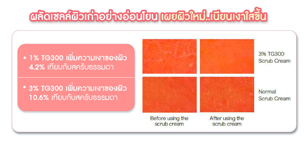 • ผลิตภัณฑ์ที่มี TG300 3% สามารถเพิ่มความเงางามของผิวได้ถึง 10.6% เมื่อเทียบกับกลุ่มควบคุม