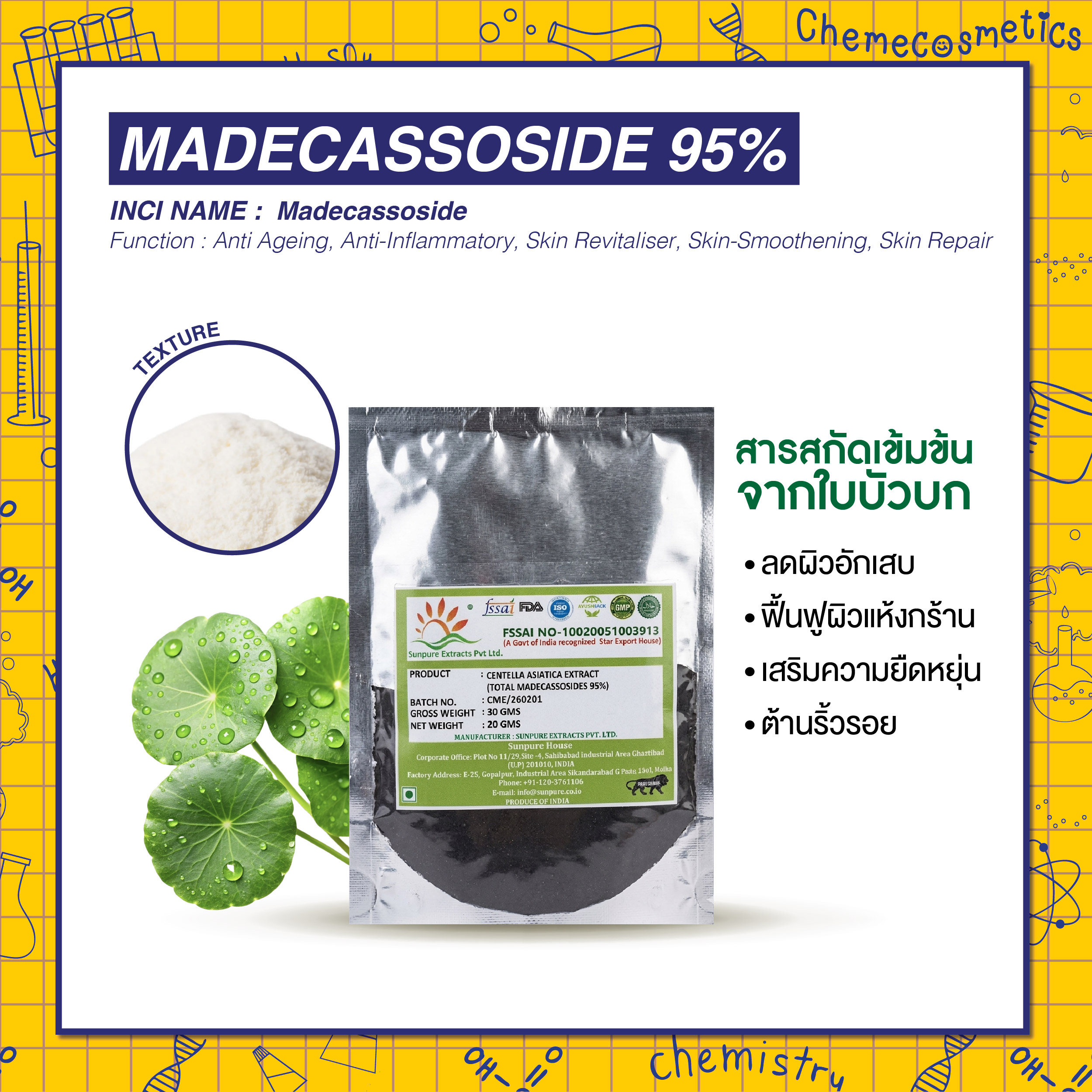 Madecassoside 95% (มาเดแคสโซไซด์) สารสกัดเข้มข้นจากใบบัวบก (Centella asiatica) ช่วยลดการอักเสบของผิว ลดรอยแดงจากสิว กระตุ้นการสร้างคอลลาเจน และช่วยปลอบประโลมผิวที่บอบบางแพ้ง่าย